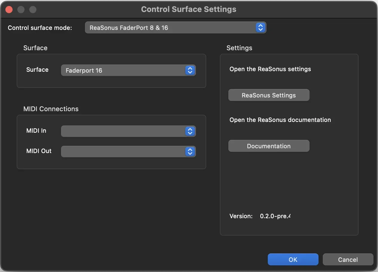 After installation you have to change some settings to make it work. The screenshot is for the FaderPort 8/16. The only difference with the FaderPort v2 version is the Surface Select.