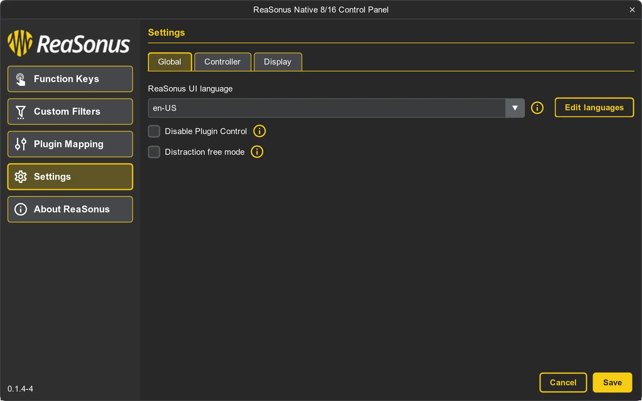 - ReaSonus UI Language: Select the language you want to use. If your language is not there (currently only en-US is supplied), Click the Edit Languages button. You can create your own languages. Read more on the Language Editor under the Goodies